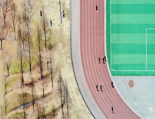 人民網(wǎng)訊 當(dāng)?shù)貢r(shí)間1月20日,韓國(guó)光州,冬日陽(yáng)光和煦,航拍韓國(guó)全南大學(xué)操場(chǎng)。