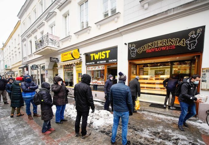 2月11日,顧客在波蘭首都華沙的一處面包房外排隊等待購買甜面包。