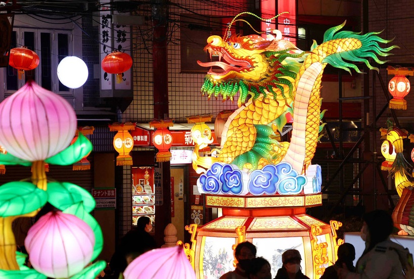 人民網(wǎng)訊 當(dāng)?shù)貢r間2月13日,為慶祝中國農(nóng)歷新年,日本橫濱中華街展出以中國文化為主題的花燈,為當(dāng)?shù)貛硇麓旱南矐c氣息。