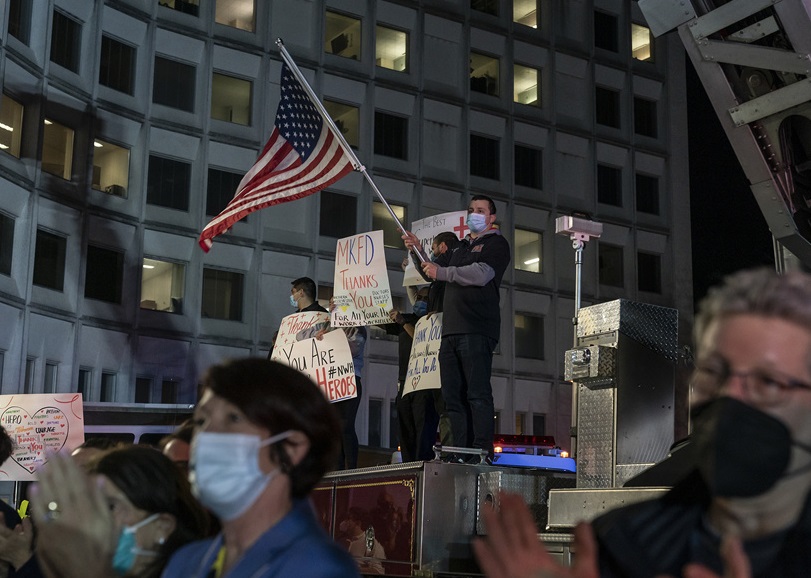 人民網(wǎng)訊 當(dāng)?shù)貢r(shí)間2021年3月11日,美國紐約州基斯科山,在世衛(wèi)組織宣布新冠肺炎為大流行病一周年之際,民眾在醫(yī)院外參加新冠疫情暴發(fā)一周年紀(jì)念日活動(dòng),致謝抗疫醫(yī)護(hù)人員、消防員和警察。