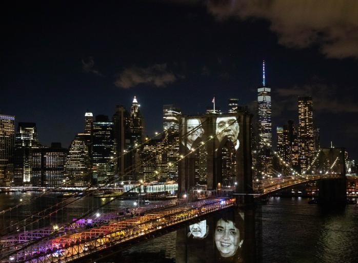 3月14日,新冠逝者的照片在紀(jì)念活動(dòng)上被投射到美國紐約布魯克林大橋上。新華社發(fā)(郭克攝)
