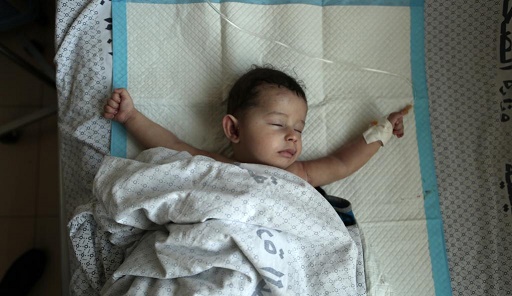 5月20日,一名因空襲受傷的巴勒斯坦兒童在加沙地帶城市汗尤尼斯的醫(yī)院中接受治療。