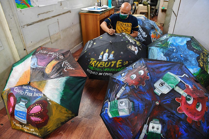 人民網(wǎng)訊 當(dāng)?shù)貢r(shí)間6月3日,印度孟買(mǎi),一所藝術(shù)學(xué)校里的藝術(shù)老師Sagar Kambli繪制新冠疫苗防疫主題雨傘,以提醒學(xué)生們通過(guò)接種新冠疫苗防疫。