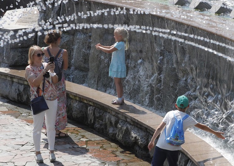 人民網(wǎng)訊 當(dāng)?shù)貢r間2021年6月24日,俄羅斯莫斯科發(fā)布橙色天氣警報,該地區(qū)溫度高達36攝氏度。人們在Manezhnaya廣場的噴泉邊避暑。