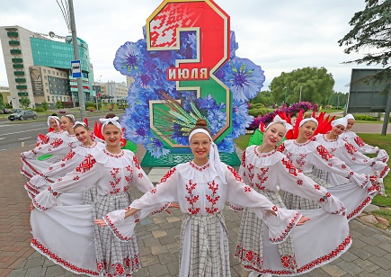7月3日,演員在白俄羅斯首都明斯克街頭表演舞蹈。