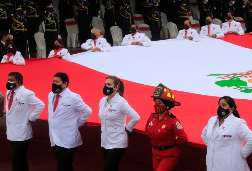 7月30日,在秘魯首都利馬陸軍總部,參加過抗疫的醫(yī)務(wù)人員和軍人舉著秘魯國旗參加閱兵式。