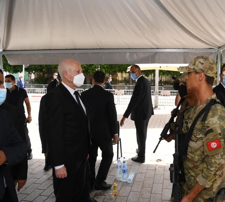 8月1日,突尼斯總統(tǒng)賽義德在首都突尼斯市中心與街頭維護(hù)治安的士兵交談。