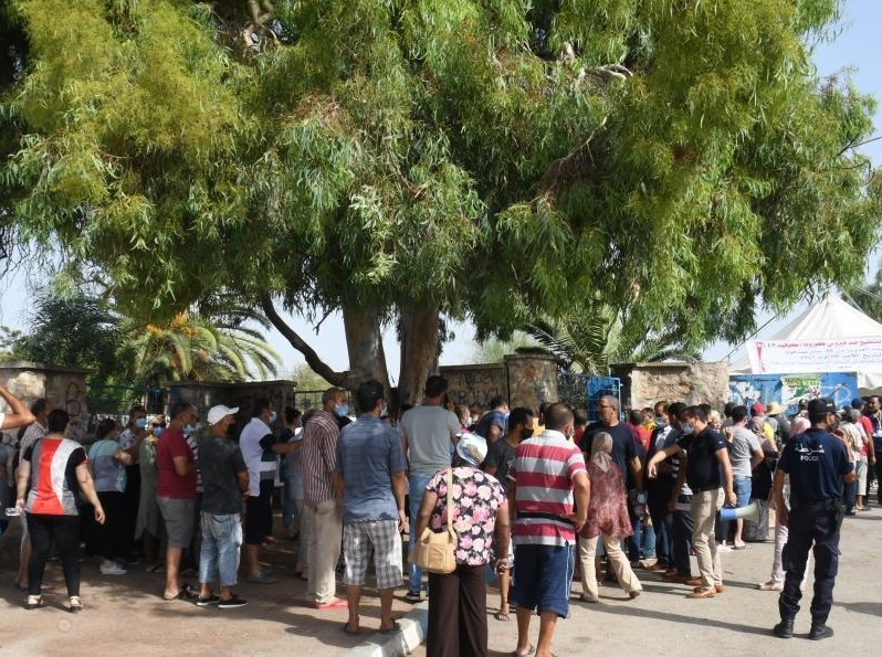 8月8日,人們在突尼斯首都突尼斯市一處新冠疫苗接種點排隊等候接種疫苗。