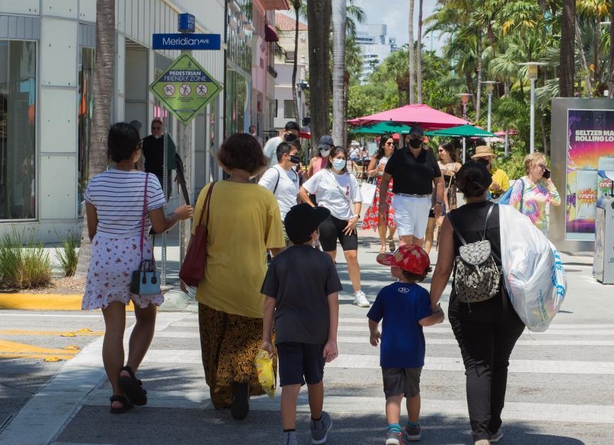 8月6日,人們在美國佛羅里達(dá)州邁阿密-戴德縣的一個商業(yè)區(qū)游覽。