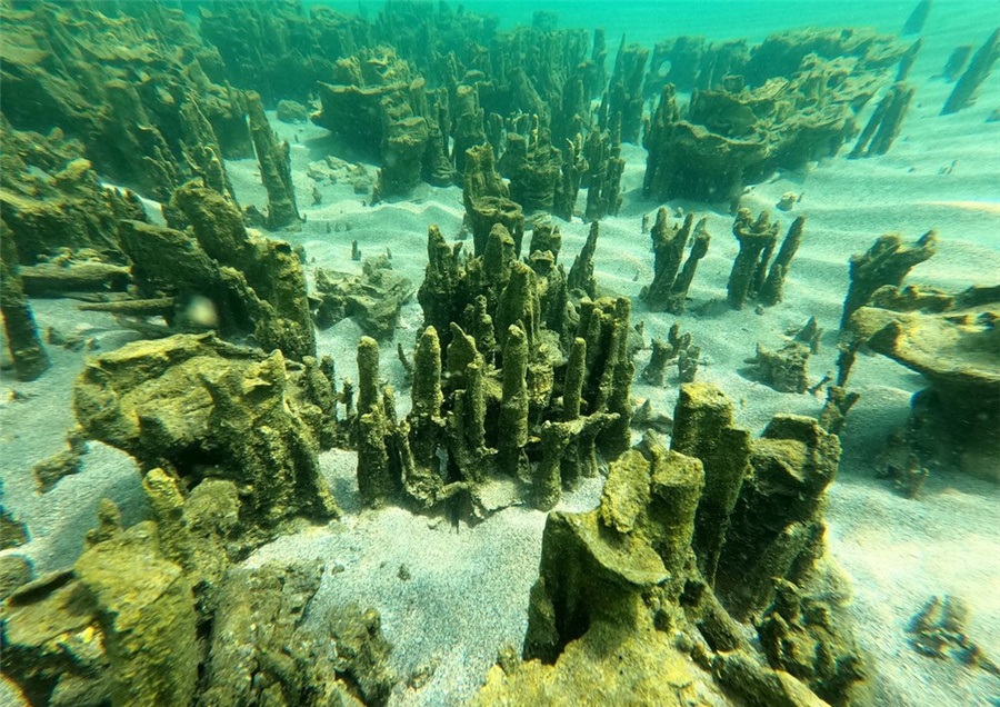人民網(wǎng)訊 當(dāng)?shù)貢r間8月8日,土耳其比特利斯省,凡湖水下發(fā)現(xiàn)新微生物巖。