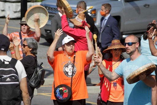 8月10日,在加拿大北溫哥華“圣保羅印第安寄宿學(xué)?!迸f址,人們?cè)谛侣劙l(fā)布會(huì)后擊鼓、唱歌。加拿大不列顛哥倫比亞省的三個(gè)原住民部族10日宣布,將對(duì)位于北溫哥華的“圣保羅印第安寄宿學(xué)?!迸f址展開調(diào)查。(新華社發(fā),梁森攝)