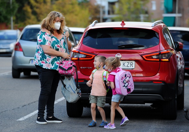 9月8日,一名家長在西班牙馬德里送孩子上學。