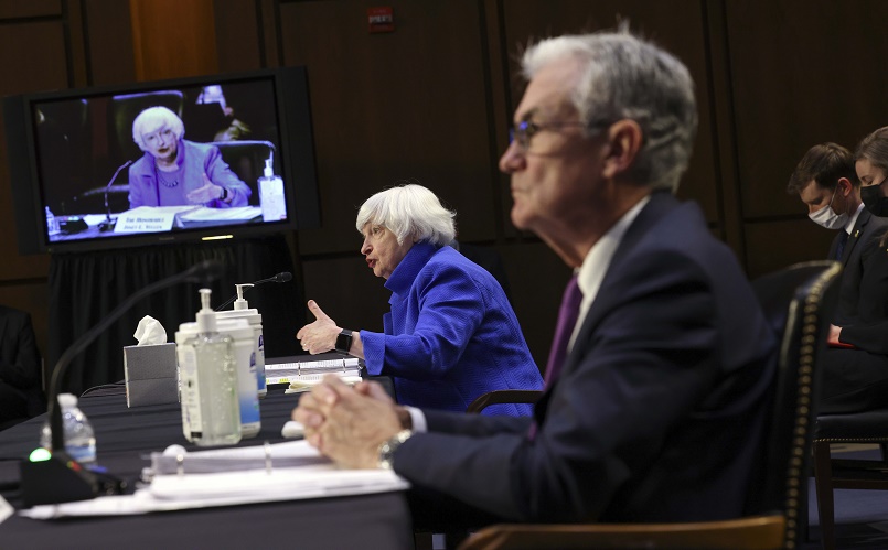 9月28日,美國財(cái)政部長耶倫(左一)在華盛頓出席國會參議院銀行、住房和城市事務(wù)委員會聽證會。
