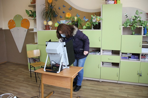 11月14日,選民在保加利亞索非亞一處投票站用電子投票機投票。