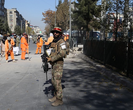11月15日,阿富汗塔利班安全人員站在首都喀布爾的爆炸現(xiàn)場。