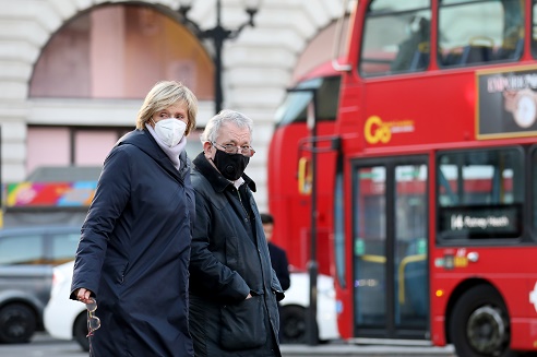 11月25日,人們?cè)谟?guó)倫敦佩戴口罩出行。