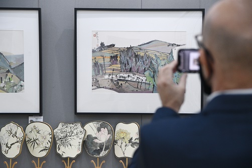 12月2日,馬耳他藝術(shù)協(xié)會(huì)主席阿德里安·馬莫在馬耳他首都瓦萊塔舉行的當(dāng)代中國畫藝術(shù)展上拍照。