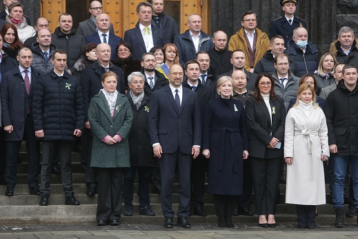 2月16日,在烏克蘭首都基輔,烏克蘭內(nèi)閣成員在烏政府辦公大樓前參加團(tuán)結(jié)日慶?;顒?dòng)。