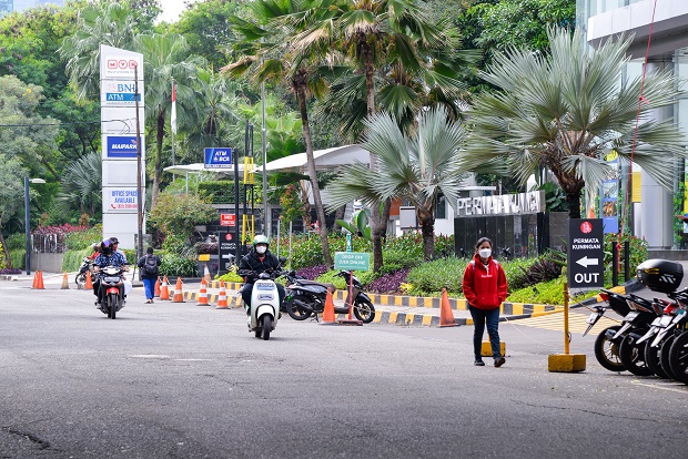 2月17日,人們佩戴口罩經(jīng)過印度尼西亞首都雅加達(dá)的一棟寫字樓前。