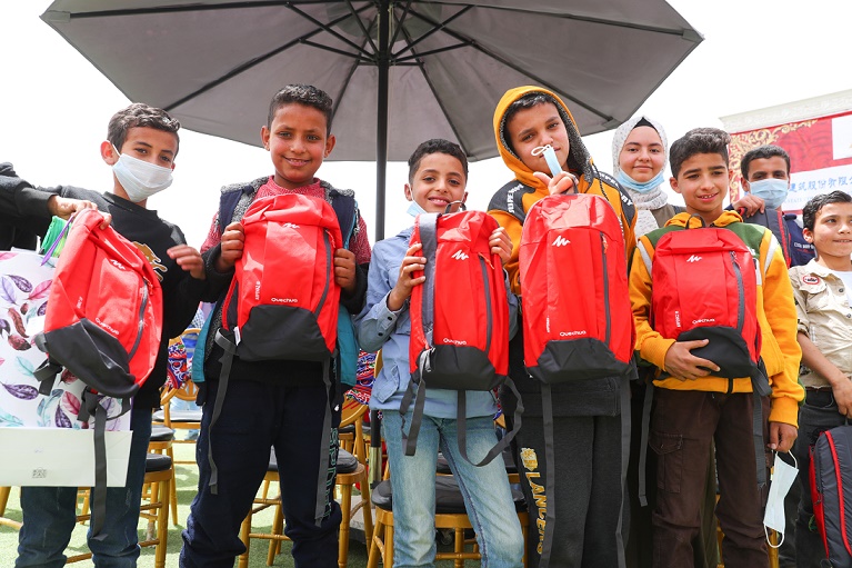 4月16日,在埃及開羅,孩子們?cè)邶S月慈善活動(dòng)上展示收到的書包。