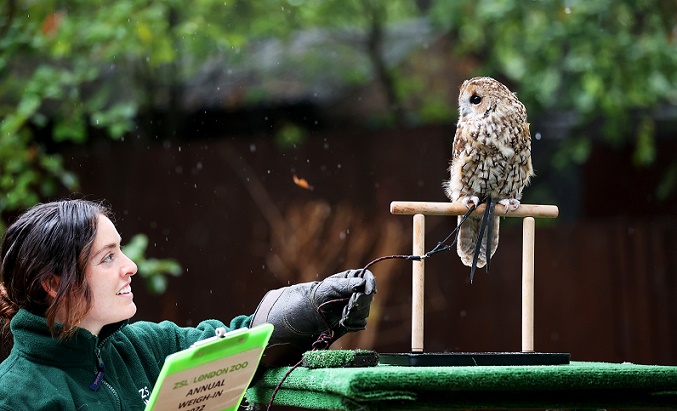 圖為25日,在英國倫敦動物園,工作人員為一只貓頭鷹稱重。 新華社記者 李穎 攝