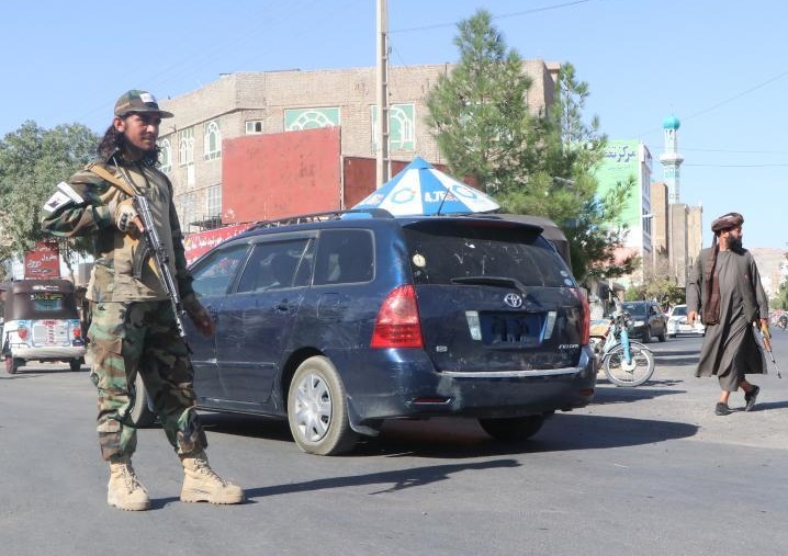 9月2日,在阿富汗赫拉特省發(fā)生爆炸的清真寺附近,安全人員設(shè)卡檢查。