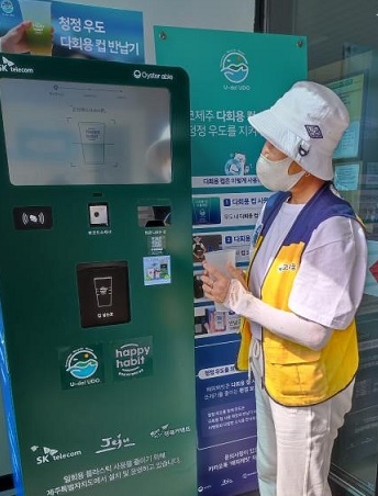 一般游客在進入牛島前,可以在碼頭等處掃碼,簽署支持牛島資源循環(huán)運動的聲明。游客用完島上餐飲商鋪提供的可重復(fù)使用塑料杯后,可將其放入回收設(shè)備,回收后的杯子經(jīng)過清洗、消毒等流程后將被重復(fù)利用。為鼓勵游客積極參與,回收終端提供積分、現(xiàn)金返還和交通卡充值等形式的獎勵。此外,對于沒有用完的塑料杯,游客可以帶出牛島,在濟州島主要交通設(shè)施、指定咖啡店等處利用回收設(shè)備進行回收。