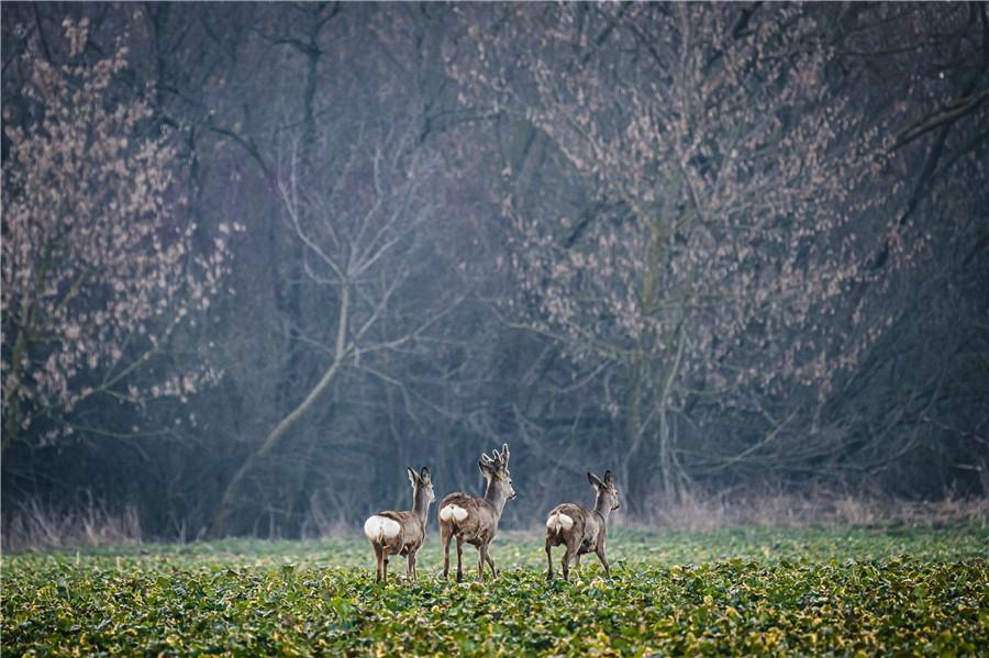 當(dāng)?shù)貢r(shí)間2023年3月19日,波蘭托波諾村,3只歐洲狍在田間漫步。