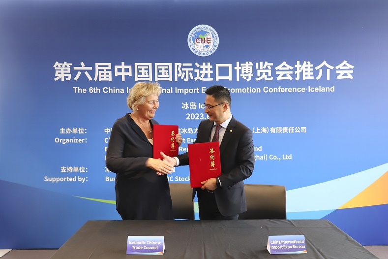 16日,在冰島雷克雅未克,冰中貿(mào)促會主席約尼娜·比亞特馬斯與中國國際進(jìn)口博覽局簽署合作備忘錄。新華社記者 陳靜 攝