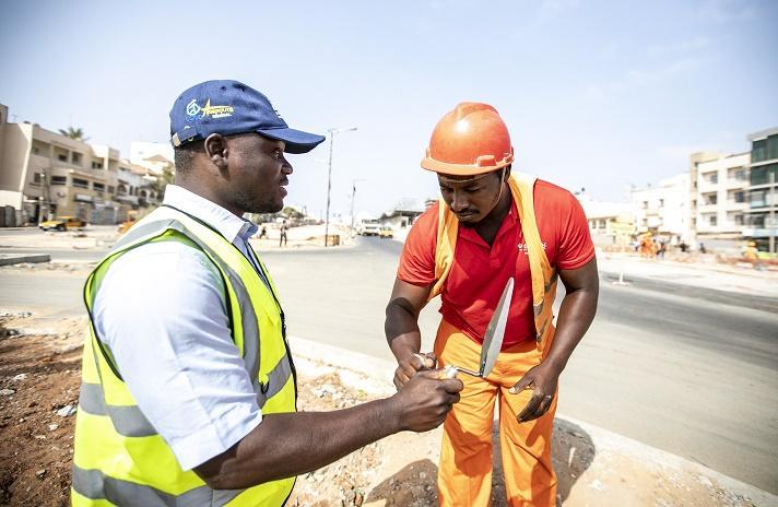 5月13日,蘇信(左)在塞內(nèi)加爾達(dá)喀爾快速公交項(xiàng)目建設(shè)工地與同事交流。新華社記者 李亞輝 攝