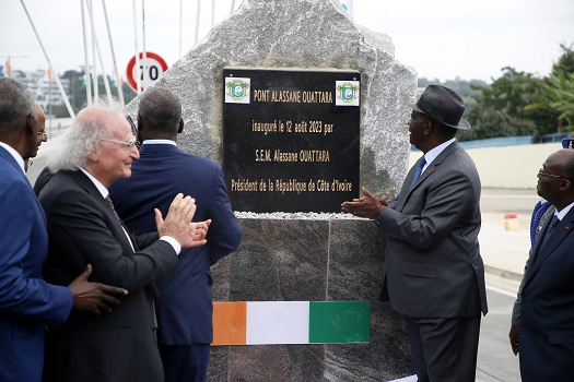 12日,在科特迪瓦經(jīng)濟(jì)首都阿比讓,科特迪瓦總統(tǒng)瓦塔拉(右二)為科科迪橋揭幕。新華社發(fā)(伊萬(wàn)·宋攝)