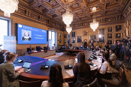 這是9日在瑞典斯德哥爾摩拍攝的2023年諾貝爾經(jīng)濟(jì)學(xué)獎(jiǎng)公布現(xiàn)場(chǎng)。新華社發(fā)(魏學(xué)超攝)