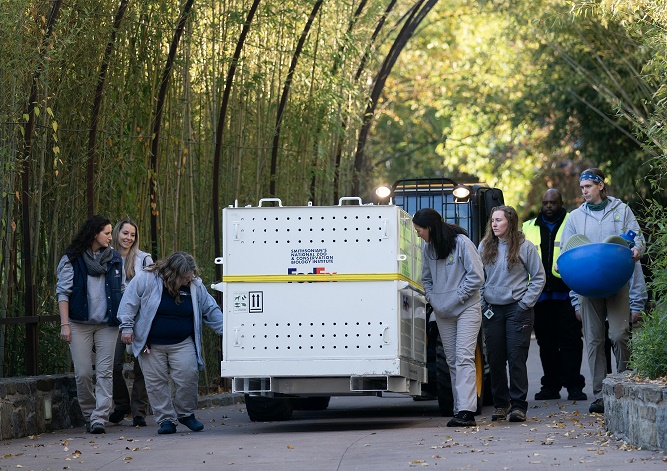 8日,在美國華盛頓史密森學(xué)會國家動物園,裝有大熊貓的箱子準(zhǔn)備被運(yùn)往機(jī)場。新華社記者 劉杰 攝
