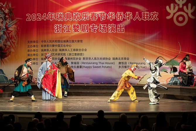 2月2日,瑞典斯德哥爾摩中國文化中心在斯德哥爾摩舉辦活動,通過美食、年畫、彩燈、舞龍和婺劇等多種形式,讓當(dāng)?shù)孛癖姾腿A僑華人享受了一場“歡樂春節(jié)”的文化大餐。這是演員在活動中表演婺劇。新華社發(fā)(魏學(xué)超攝)