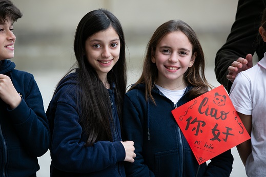當(dāng)日,在意大利羅馬,羅馬國(guó)立住讀學(xué)校學(xué)生展示自己制作的中意雙語(yǔ)標(biāo)語(yǔ)牌。 新華社記者 李京 攝
