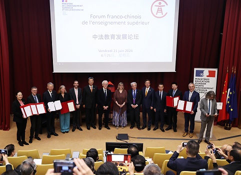 6月21日,中國教育部與法國高等教育和科研部在法國巴黎共同舉辦首屆中法教育發(fā)展論壇。中國教育部部長懷進(jìn)鵬(左六)與法國高等教育和科研部部長勒塔約(右七)共同出席論壇并致辭。新華社記者 高靜 攝
