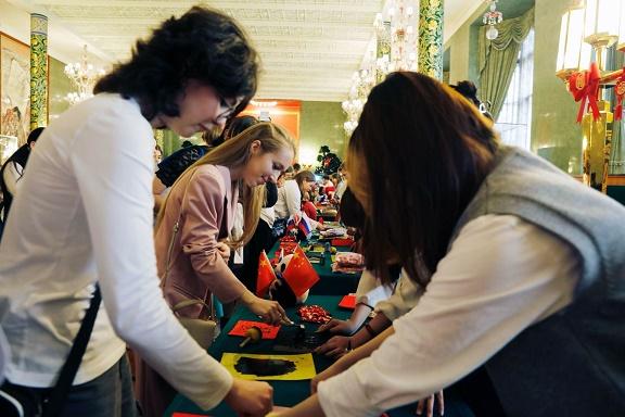中俄兩國學(xué)生攜手奉獻(xiàn)了一場精彩的中國文化展演。民樂合奏《云宮迅音》、短劇《西游記之三打白骨精》、詩朗誦《沁園春?雪》、武術(shù)《武魂》和歌曲《嘻唰唰》《夢想從心開始》以及精彩互動,充分展現(xiàn)了同學(xué)們中文學(xué)習(xí)成果和對中國文化的理解。書法、剪紙、雕版印刷、民族服飾等15個中華文化體驗展臺,吸引同學(xué)們紛紛駐足??绝啞⑷鈯A饃等中國小吃讓來賓體驗到中國飲食文化的豐富多彩。