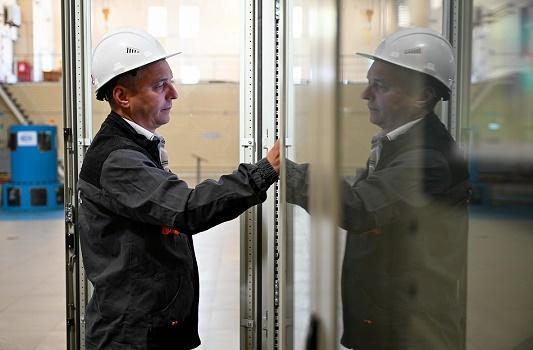5月8日,在哈薩克斯坦東哈州的圖爾古孫水電站,水電站現(xiàn)場(chǎng)調(diào)度員涅波米亞什奇在發(fā)電機(jī)層巡檢水輪發(fā)電機(jī)組運(yùn)行狀態(tài)。新華社記者 李任滋 攝
