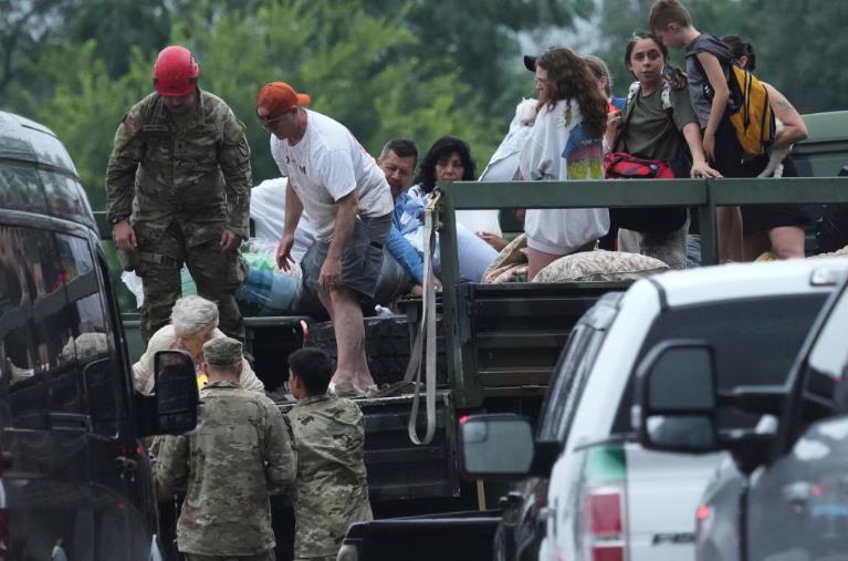 7月4日,在美國(guó)得克薩斯州英格勒姆市,應(yīng)急人員轉(zhuǎn)移受洪水影響的民眾。新華社/美聯(lián)