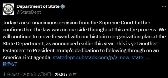 美國(guó)國(guó)務(wù)院當(dāng)天在社交媒體上發(fā)文說:“我們將繼續(xù)推進(jìn)國(guó)務(wù)院的歷史性重組工作?!?/p>
