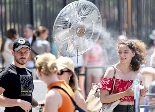 受“熱穹頂”影響,6月以來,乃至進入7月,極端高溫天氣席卷北半球多國。圖為6月27日,在意大利羅馬,游客在斗獸場附近一處風扇下納涼。 新華社記者 李京 攝