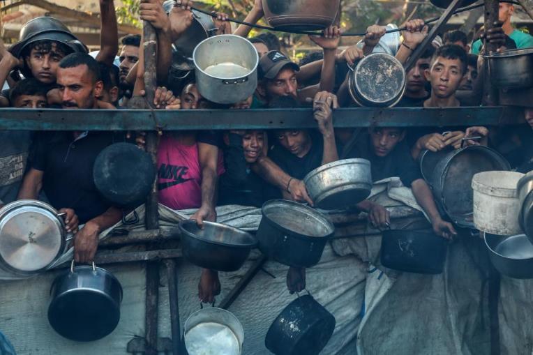7月20日,在加沙城,當(dāng)?shù)孛癖姷却I(lǐng)取食物。新華社發(fā)(里澤克·阿卜杜勒賈瓦德攝)