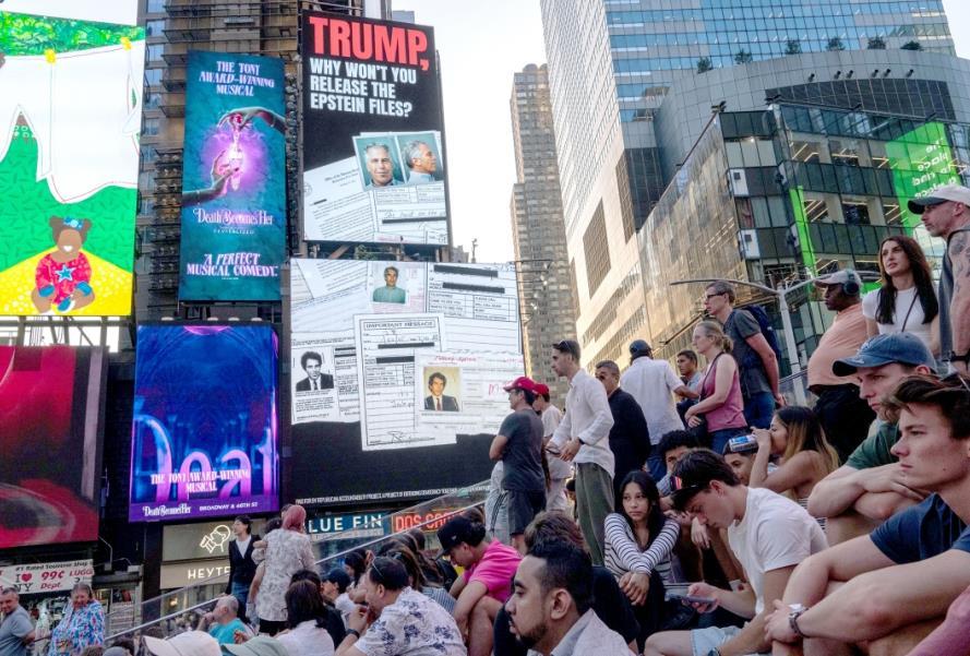 圖為當(dāng)?shù)貢r(shí)間7月23日,美國(guó)紐約時(shí)報(bào)廣場(chǎng)廣告牌呼吁公開愛(ài)潑斯坦案所有文件。 CFP供圖