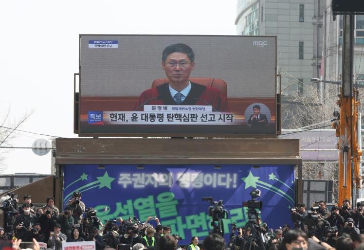 4月4日,民眾在韓國首都首爾的韓國憲法法院附近觀看尹錫悅彈劾案宣判過程的電視直播。新華社記者姚琪琳攝