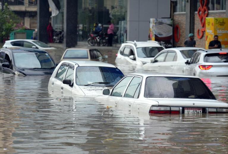 8月19日,在巴基斯坦南部港口城市卡拉奇,暴雨過(guò)后車輛浸泡在積水中。新華社發(fā)