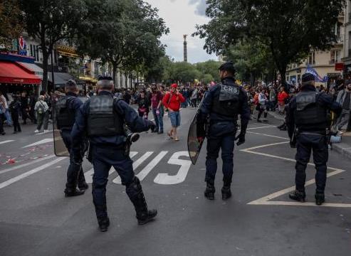 9月10日,警察在法國巴黎夏特萊廣場附近的游行示威現(xiàn)場警戒。新華社發(fā)(奧雷利安·莫里薩爾攝)