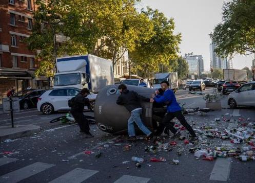 9月10日,在法國巴黎街頭,示威者用垃圾桶封鎖道路。新華社發(fā)(奧雷利安·莫里薩爾攝)