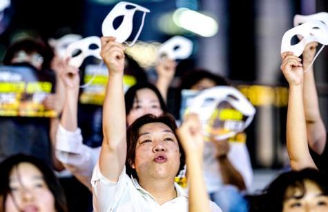 圖為當地時間2024年8月30日,韓國首爾,抗議者舉行示威,反對深度偽造色情片,活動人士佩戴面具。 CFP供圖