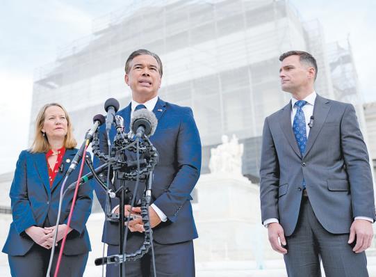 當地時間11月5日,美國華盛頓特區(qū),美最高法院就政府關稅政策合法性舉行聽證會后,加州司法部長羅伯·邦塔(中)等人在最高法院外向媒體發(fā)表講話。 CFP供圖