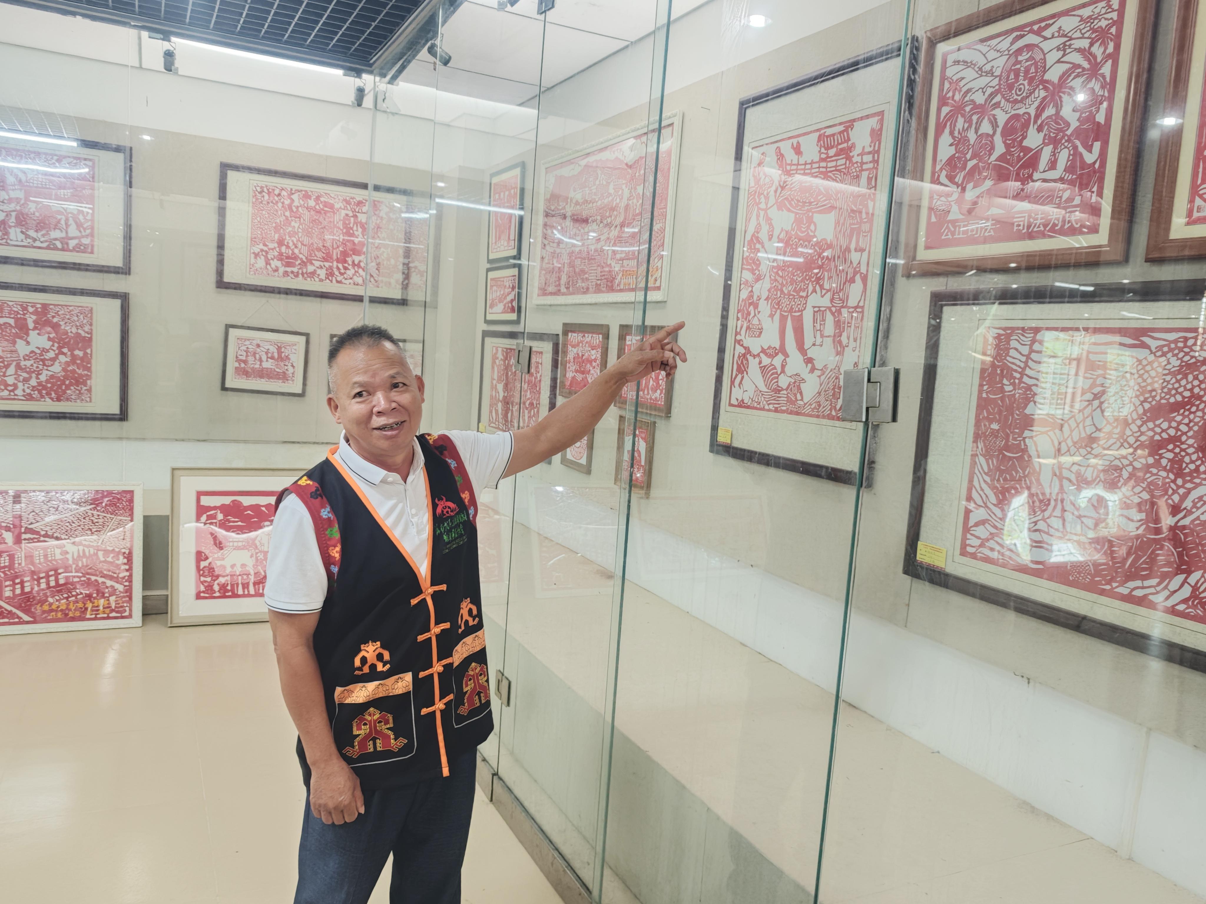 “剪紙以前大多是剪一些吉祥圖案、民族傳說。在縣司法局的指導(dǎo)下,我開始嘗試將法治元素融入剪紙藝術(shù),創(chuàng)作大量的法治題材剪紙作品?!贝蟀布艏埣妓囀〖墏鞒腥肆治纳硎?,他積極參與法治剪紙進(jìn)校園、進(jìn)鄉(xiāng)村等普法宣傳活動,讓學(xué)生和黎族村民在欣賞精美剪紙的同時,接受法治文化的熏陶。
